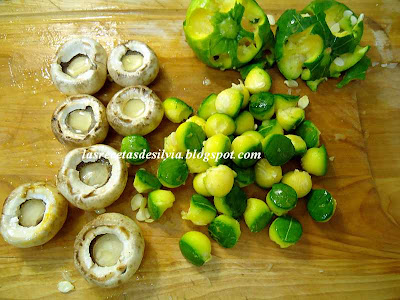 Picar los cabos de los champiñones y reservar los “sombreros” :-))